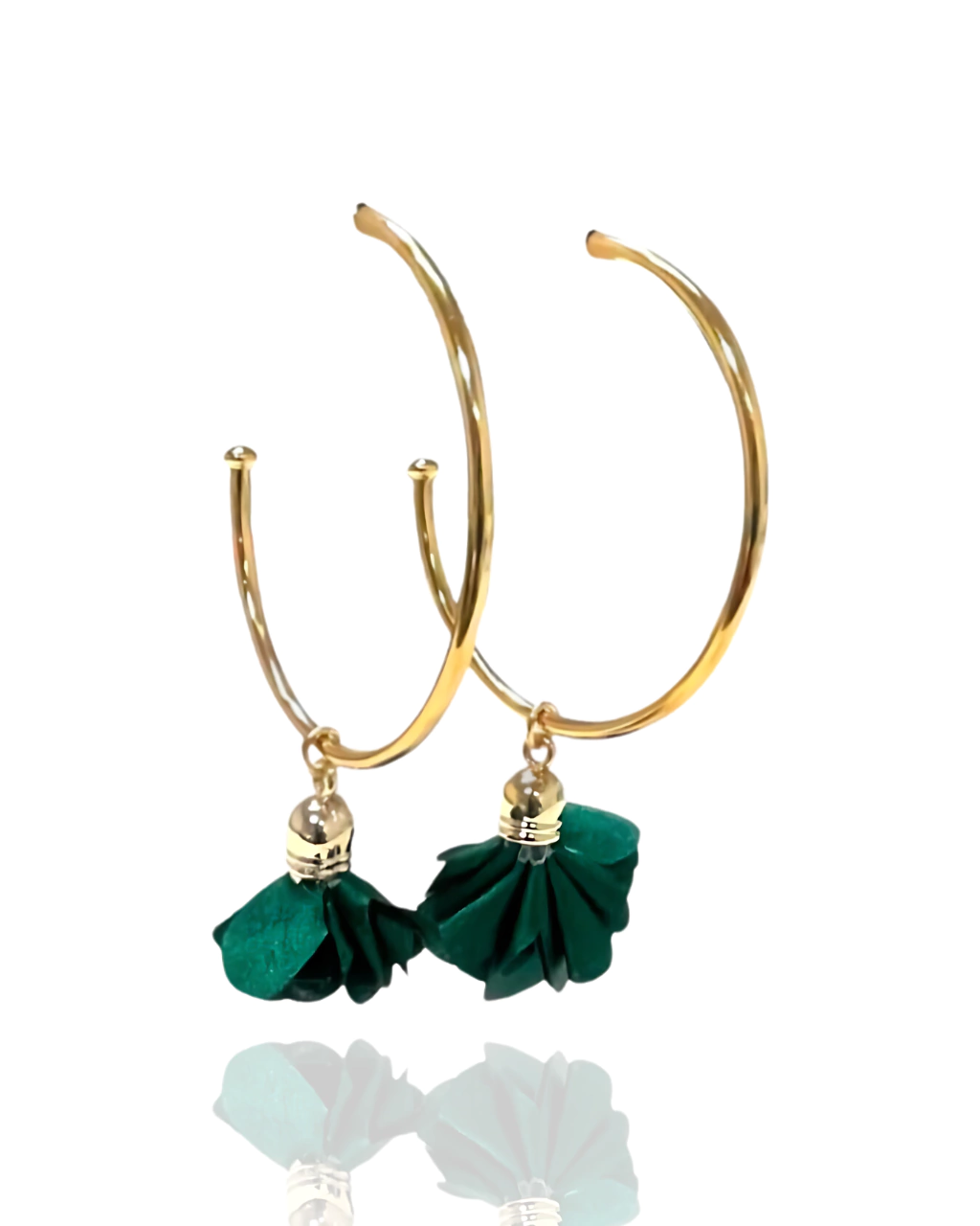 O brinco é composto por uma argola de metal dourado de alta qualidade e uma flor de seda finamente confeccionada. A união desses materiais cria uma peça leve e confortável de usar, com um acabamento impecável que garante durabilidade e beleza duradoura.